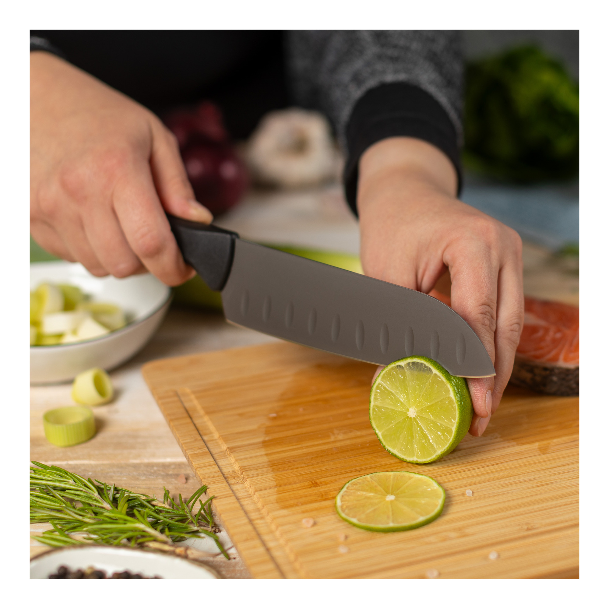 - Santoku blade ideal for slicing, dicing and chopping